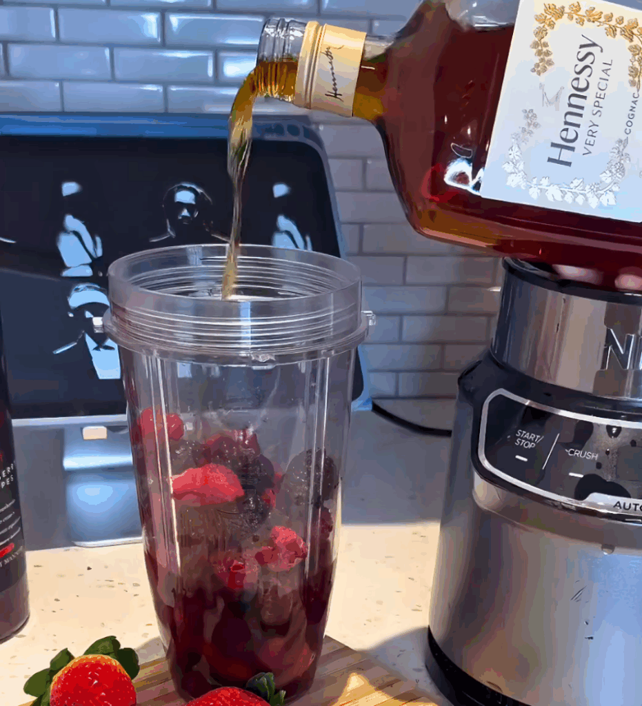 1. Add cranberry grape juice, frozen berries, Moscato, and Hennessy to a high-powered blender.