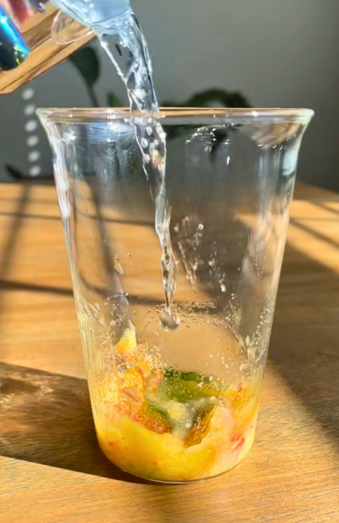 - Fill the cup with ice, then toss in a few more peach slices for texture and sweetness.