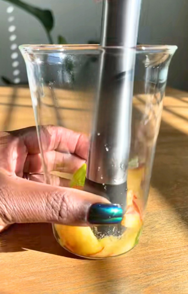 - In a sturdy cup or cocktail shaker, add lime wedges, fresh mint, and a few peach slices.