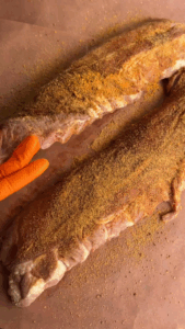 Remove the ribs from the soak and pat dry. Season them all over with your BBQ dry rub—be generous. As the creator says, “Season them ribs down to the bone so your food don’t taste like a one-sided relationship.”