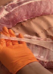 Put on those gloves and remove the membrane from the back of the ribs. This helps the seasoning penetrate better and keeps the texture perfect.