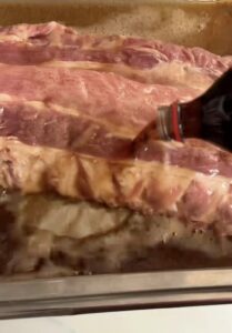 Place the ribs in a container and pour Coca-Cola until they’re fully covered. Let them soak in the fridge for at least 2–4 hours, but no more than 12. This tenderizes the meat without adding a soda taste.
