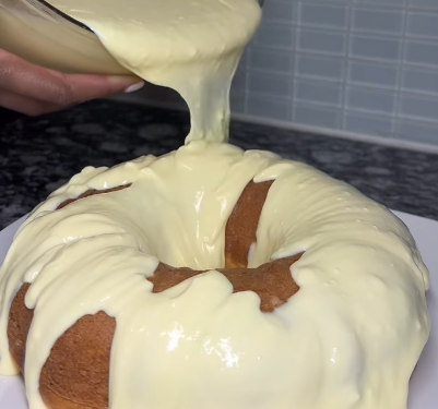 - Pour the pudding mixture evenly over the cake, allowing it to sink into the holes.