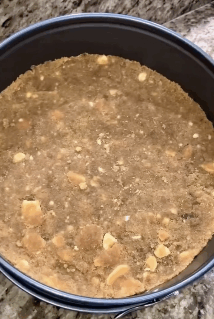 - Press the crust into a 9” cheesecake pan and bake at 350°F for 10–12 minutes