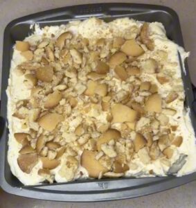 - Gently fold in the sliced bananas and crushed vanilla wafers.