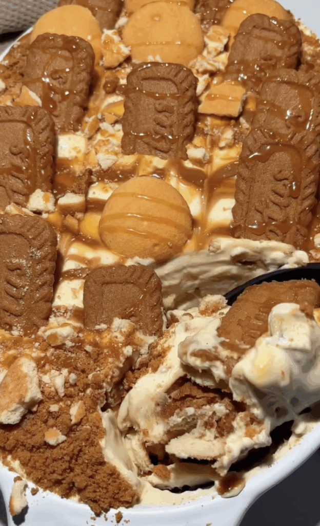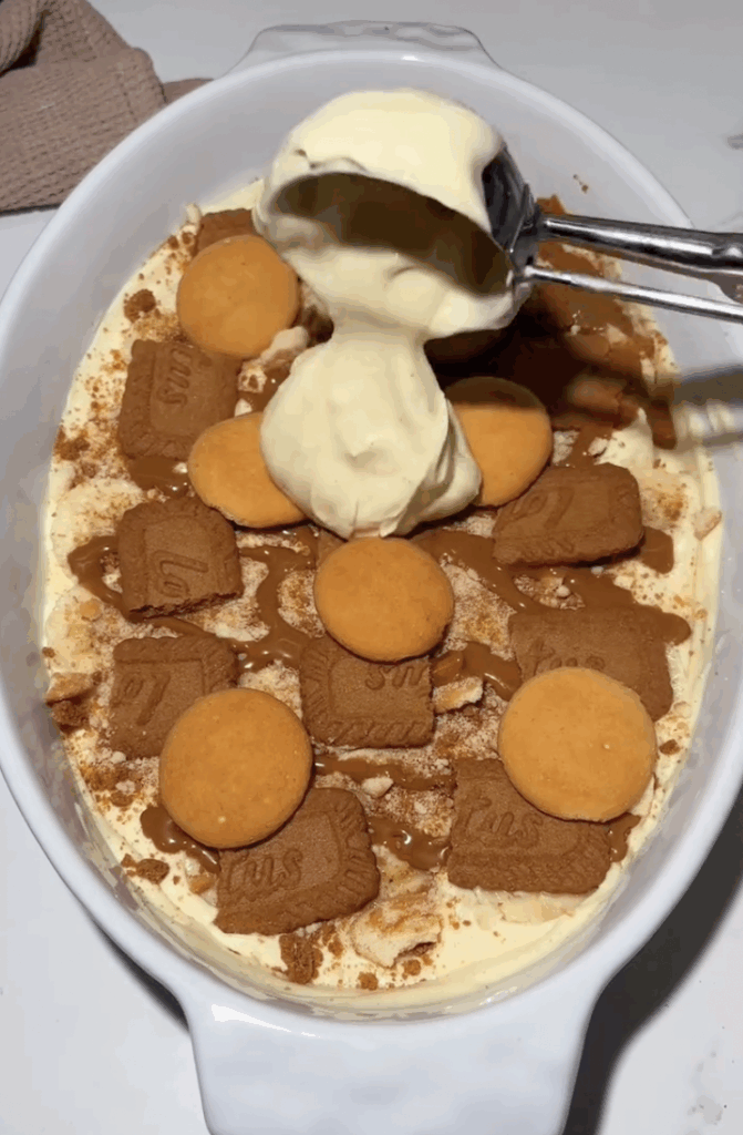 - Spread a layer of pudding, then add bananas, crushed cookies, and a drizzle of Biscoff spread.