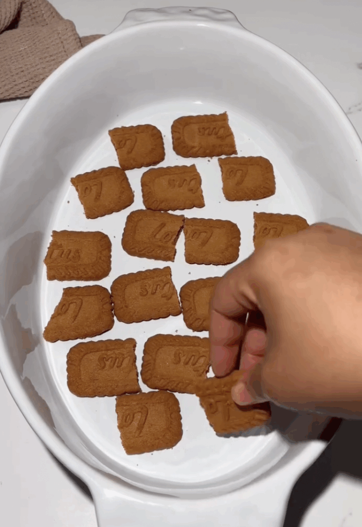 - Line a large dish with Biscoff cookies and vanilla wafers.