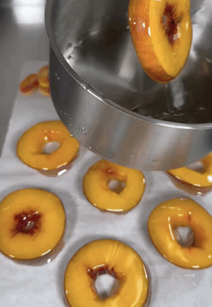 - Slice fresh peaches into rings, removing the center, and freeze them overnight.