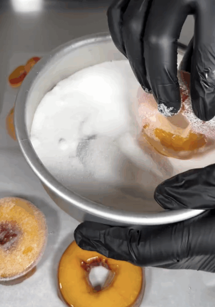 - Roll each dipped peach ring in granulated sugar for that classic candy sparkle and texture.