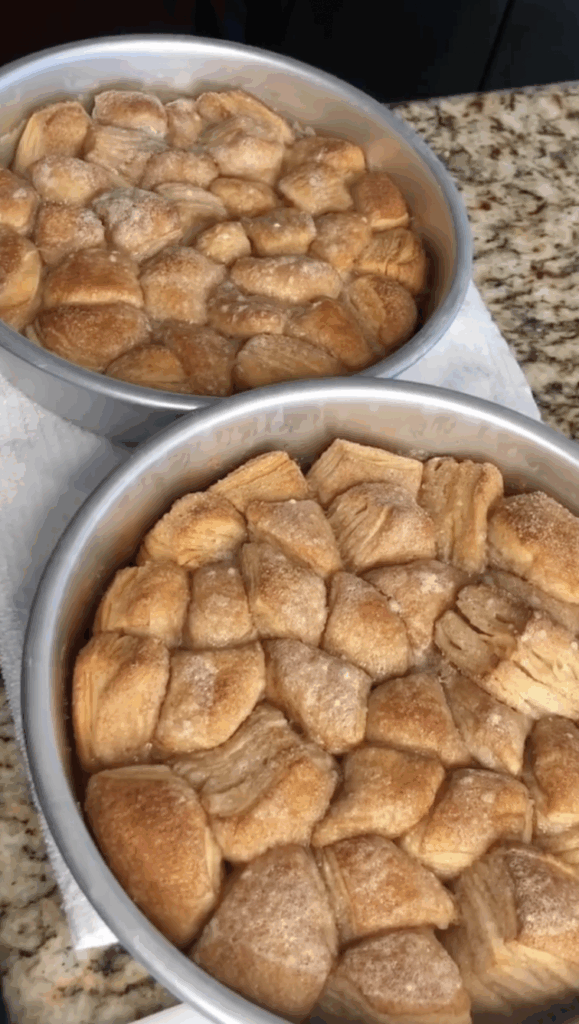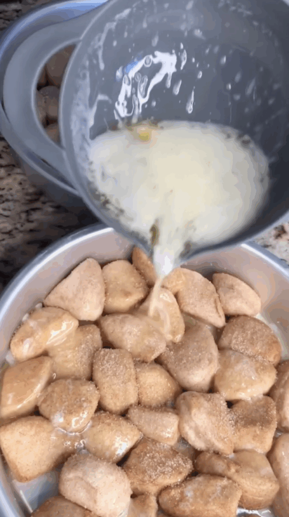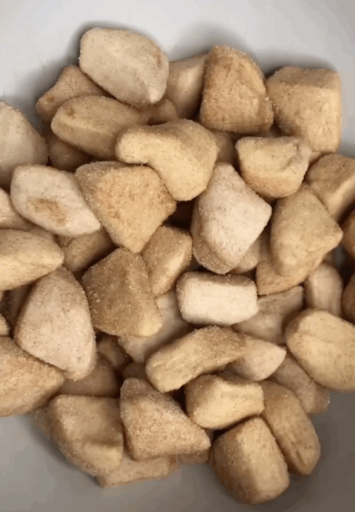 - Toss the biscuit pieces into the cinnamon-sugar mixture, making sure each one is coated generously.