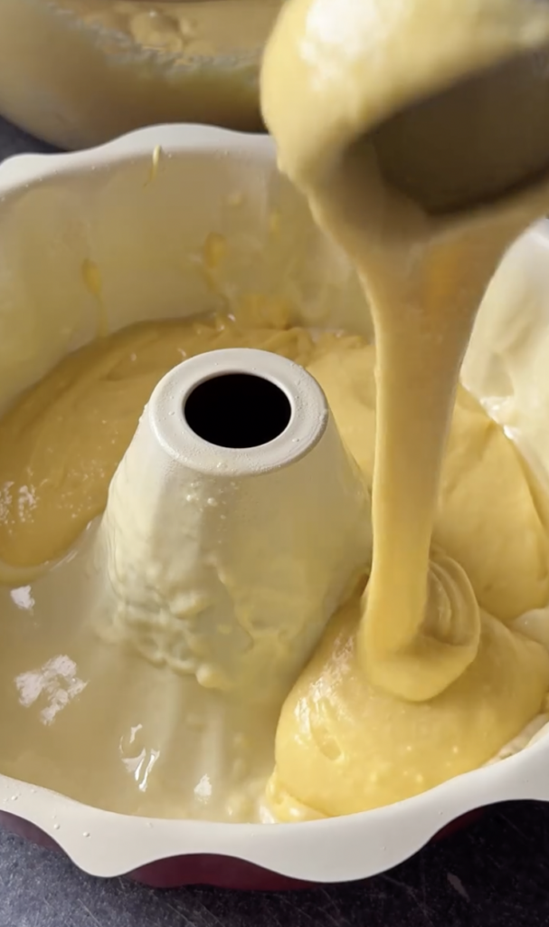Pour the batter into the bundt pan and gently tap it on the counter to release air bubbles.