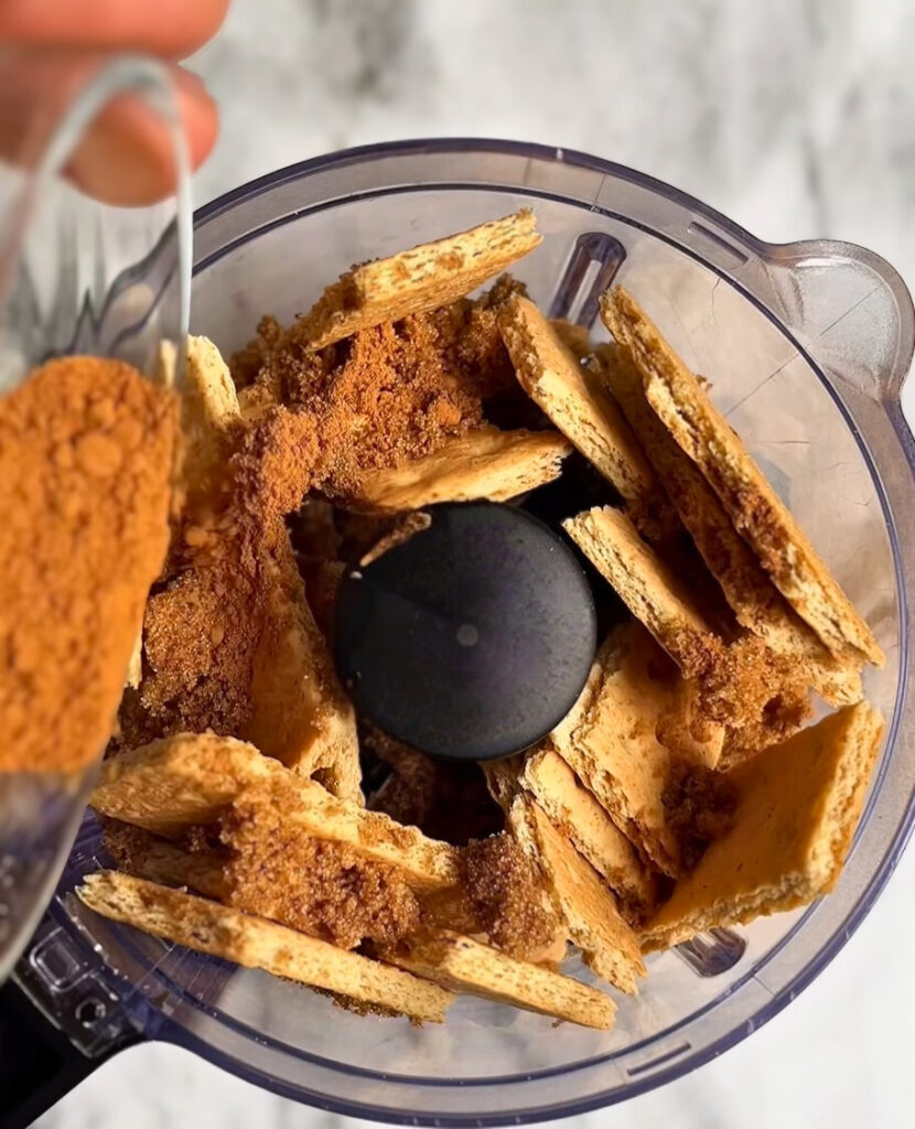 - In a food processor, pulse graham crackers, brown sugar, cinnamon, and salt into a medium-fine crumb.
