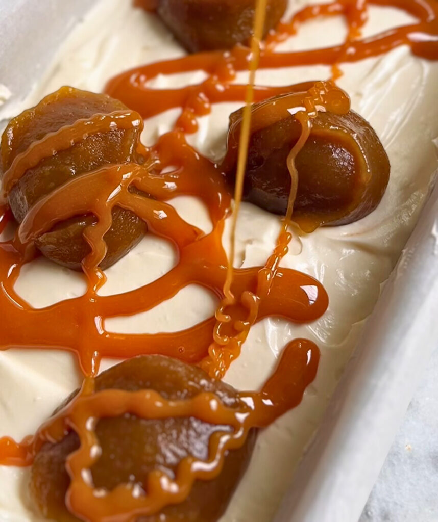 - Add a few tablespoons of apple butter and a drizzle of caramel over the cheesecake layer.