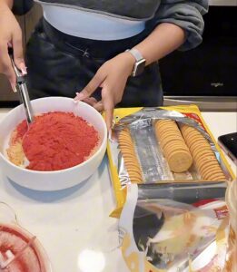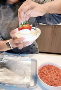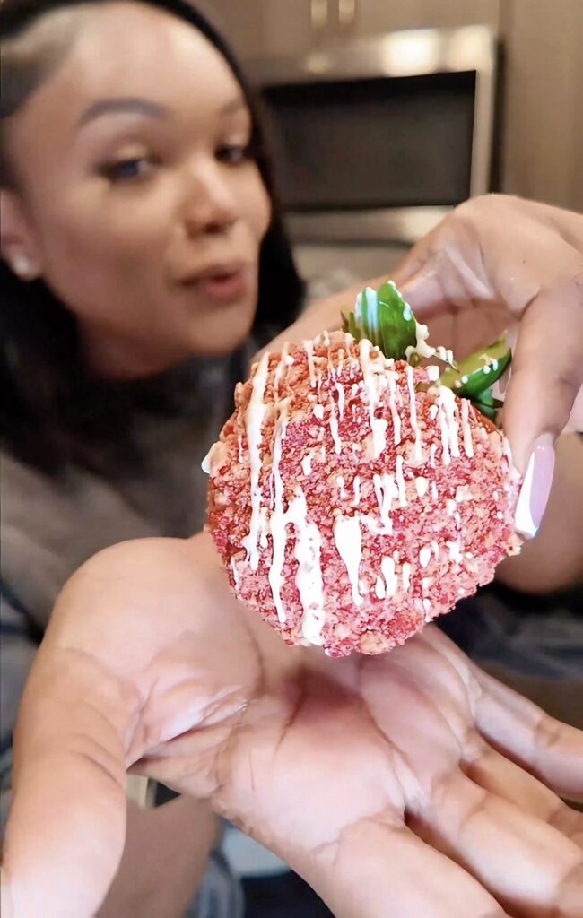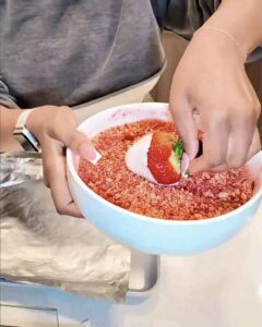 This mouthwatering image is sourced from the Instagram reel by @prettycash, featuring the iconic crunchy strawberry covered in crushed cookie goodness.