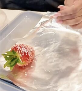 Place the coated strawberries on a parchment- or foil-lined baking sheet. Let them chill in the fridge for 15–30 minutes until the chocolate is firm.