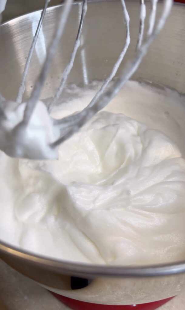 Using a stand mixer or hand mixer, whip the egg whites on high speed until soft peaks form. Add sugar and vanilla, then continue whipping until glossy peaks hold their shape.