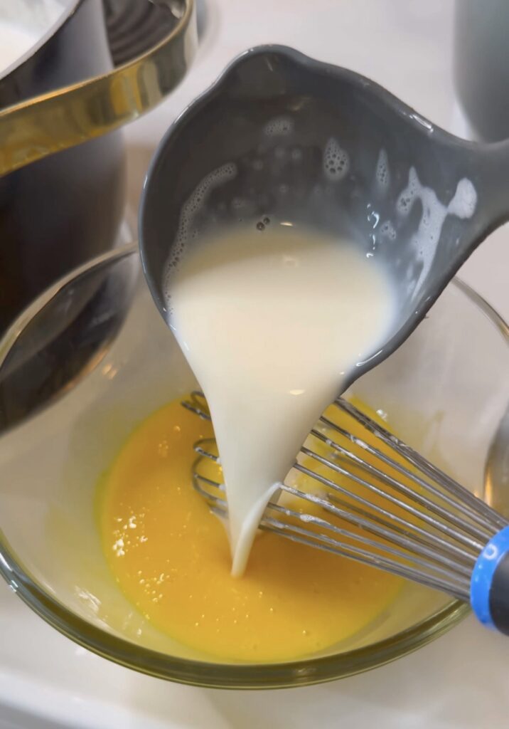 To prevent scrambled eggs, slowly pour a bit of the hot milk mixture into the yolks while whisking constantly. Once tempered, pour the yolks back into the pot and stir until the custard thickens to a creamy consistency.