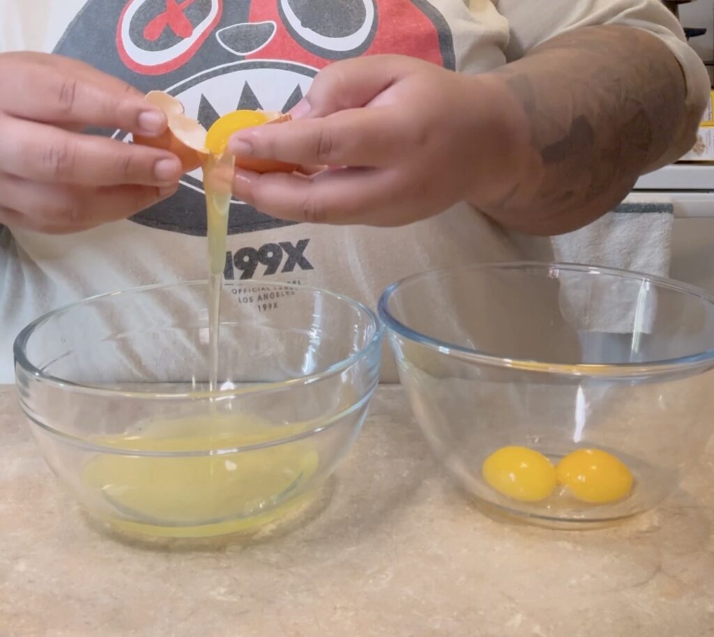 Carefully separate the yolks from the whites. Place the yolks in one bowl and the whites in another. You’ll use the yolks for the custard and the whites for the meringue.