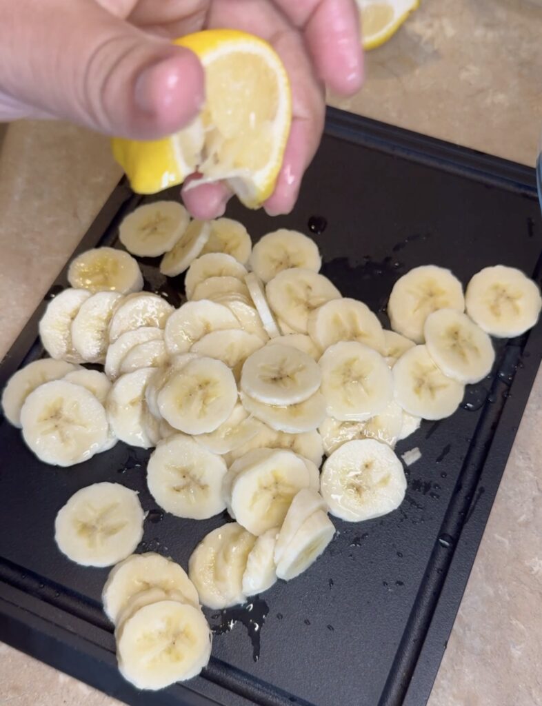 Slice the bananas thinly and toss them with lemon juice to slow browning.