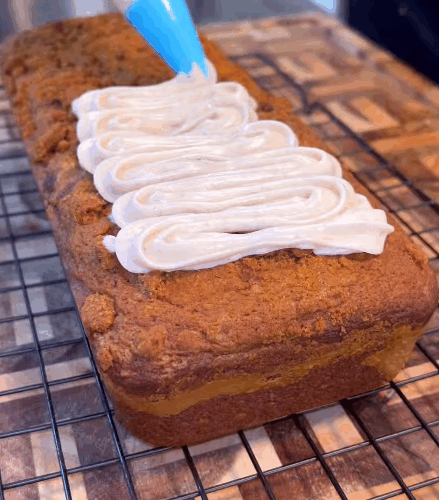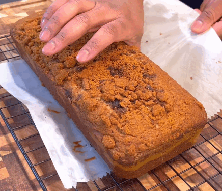 Each bite delivers nostalgia and indulgence. A swirl of Biscoff spread runs through the cake, topped with brown sugar crumble and crushed Biscoff cookies for extra texture. Finished with a cream cheese icing drizzle and more cookie crumble, this loaf is the perfect cozy treat for brunch, dessert, or holiday gifting.
