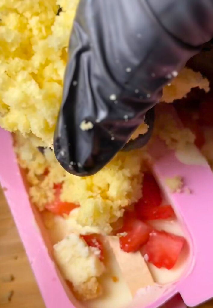 - Press in chunks of yellow cake and strawberries, gently patting them into the mold so they stick into the chocolate base.