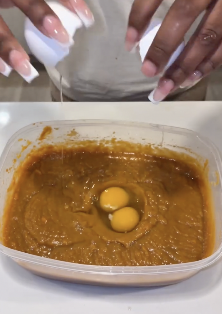 • Crack in 2 eggs and mix them thoroughly into the batter until everything is well incorporated.