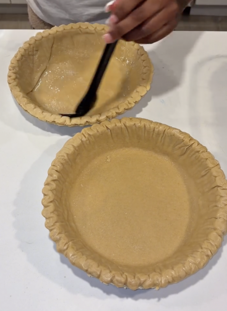 • Take your 3 deep dish pie crusts, and baste the insides with melted butter.