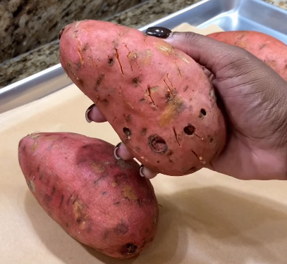 - Wash the sweet potatoes, poke holes, and roast at 425°F for 1 hour.