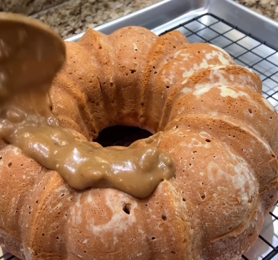 - Pour the warm caramel pecan glaze over the cake.