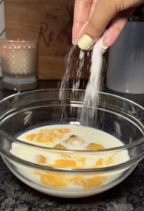 In a mixing bowl, whisk together the eggs, milk, salt, and pepper. Set this mixture aside for later.