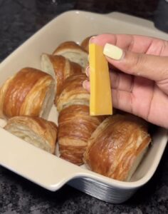 Take the cooked bacon slices and gently fold them, tucking them between croissant pieces. Cut a few thin slices of cheddar and do the same. Make sure each croissant has that cheesy, bacony love in between.