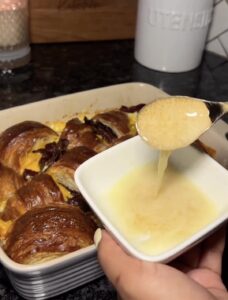 This recipe checks all the boxes: it’s simple, uses everyday ingredients, and tastes like something you’d get from a gourmet brunch spot. The buttery croissants soak up the creamy egg mixture while staying crispy on top. The bacon adds a savory punch, and that drizzle of honey butter? Pure magic.