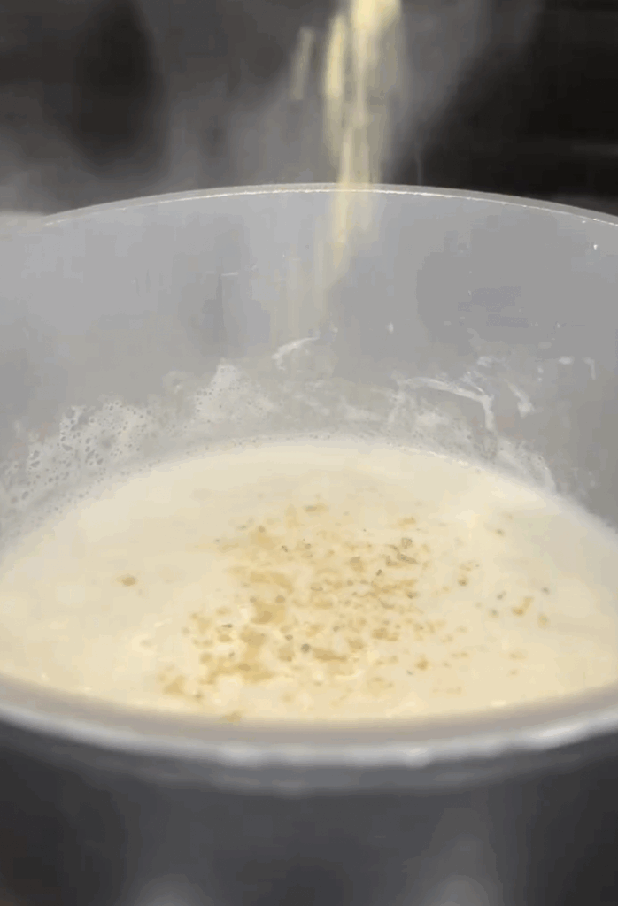 - Between each stir, add a splash of heavy cream to build smoothness and depth.