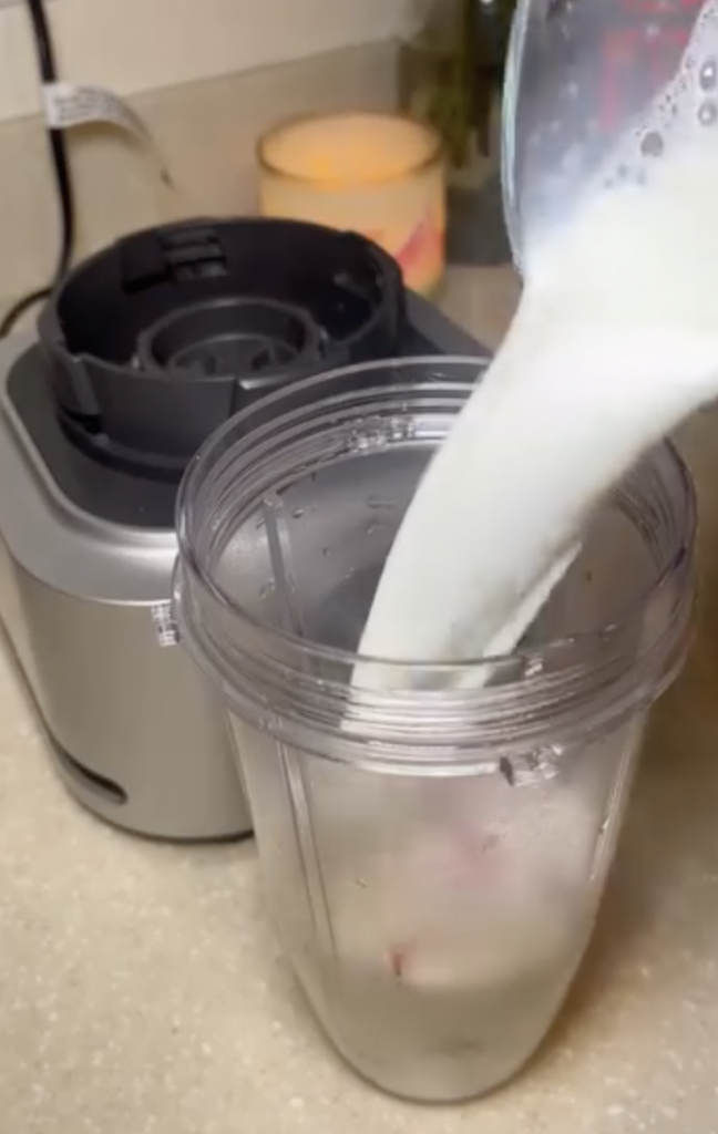 In a blender, combine 1 cup diced strawberries with 1 cup milk and blend until smooth.