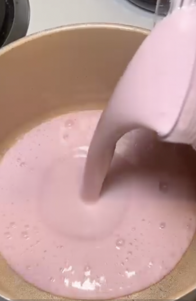 Pour the strawberry-milk blend into a saucepan over medium heat and bring it to a gentle simmer.
