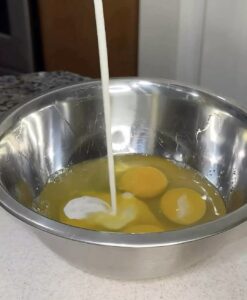 In a mixing bowl, crack the eggs and add the heavy whipping cream. Season with salt, white pepper, garlic powder, and onion powder. Beat the mixture well by hand or with a mixer until completely blended and slightly frothy.