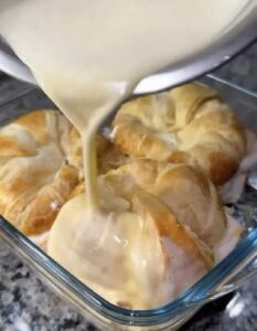 Place the dish into the oven and bake uncovered for 25–30 minutes, or until the eggs are fully set and the tops of the croissants are golden brown.