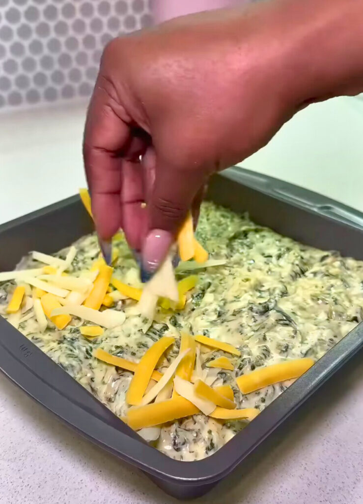 - Fold in the chopped spinach and shredded cheese, reserving some cheese for topping.