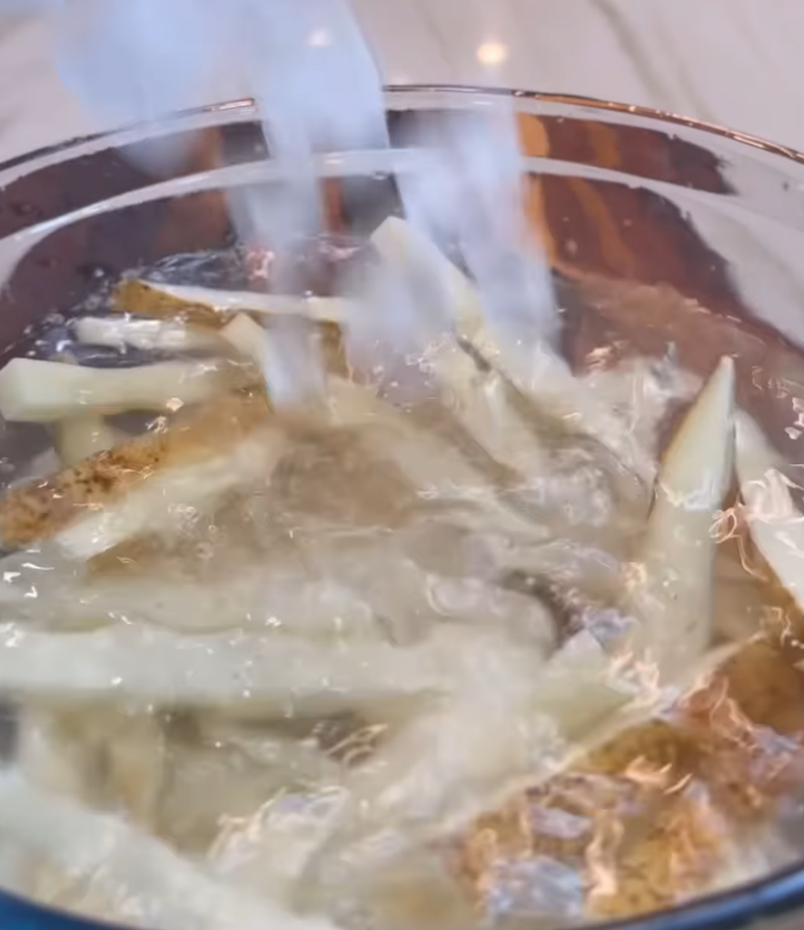 - Place fries in ice water with salt and soak for 30 minutes (mandatory for max crispiness).