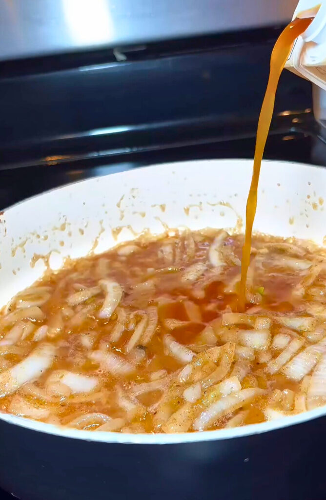 - Gradually pour in the beef broth while stirring to avoid lumps.