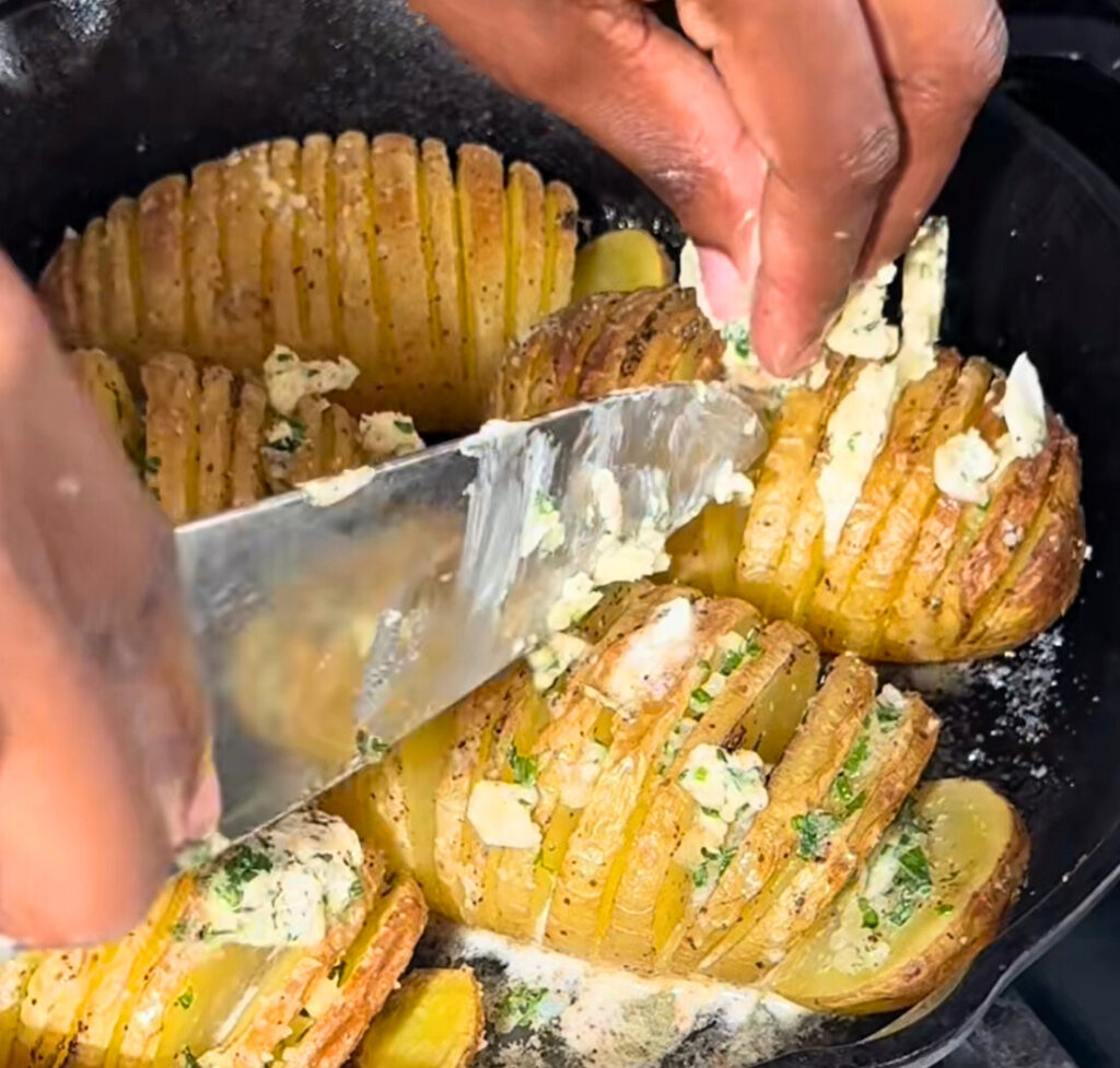 - Carefully spoon the garlic herb butter into every crevice of the sliced potatoes.