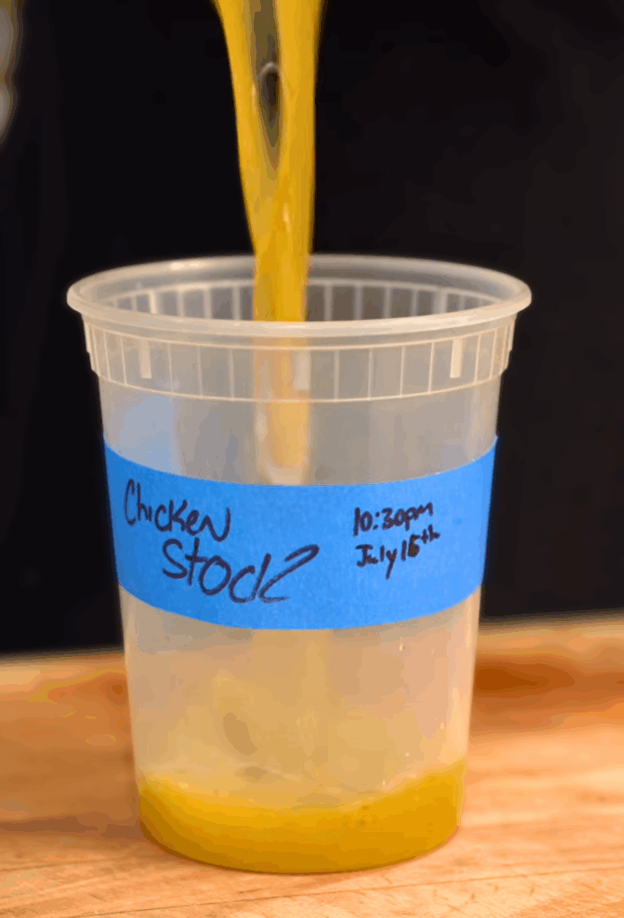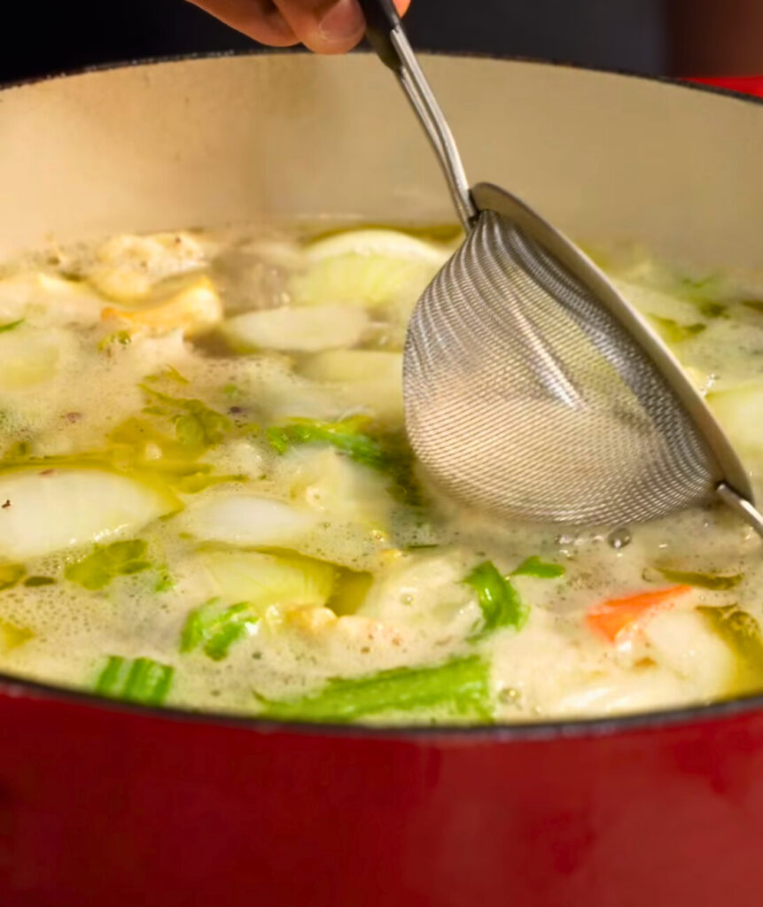 - Strain the stock through a fine mesh sieve or cheesecloth into a large bowl or container.