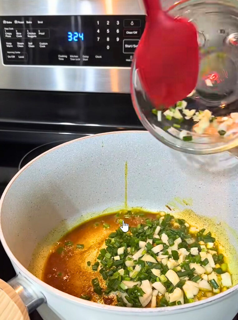 - Toss in the onion, garlic, scallions, sweet peppers, and carrots. Stir everything around for 2–3 minutes until softened.