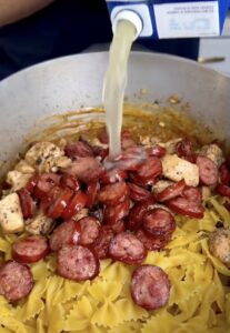 Return the cooked sausage and chicken to the pot. Add the uncooked pasta and stir everything together.