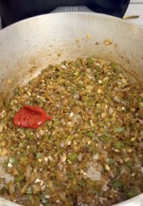 Add the diced onion, bell pepper, and celery to the pot. Cook until softened, stirring often. This trio is the heart of Southern flavor.
