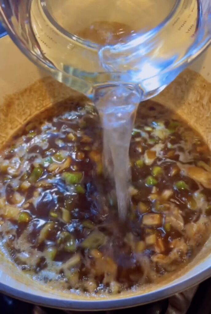 Add chopped onions, bell pepper, and celery to the roux. Sauté for 3-5 minutes until softened and fragrant.
