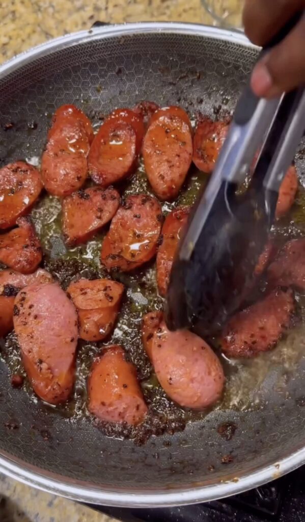 In the same skillet, add sliced sausage. Cook until browned and slightly crisp (about 5-7 minutes). Remove and set aside.