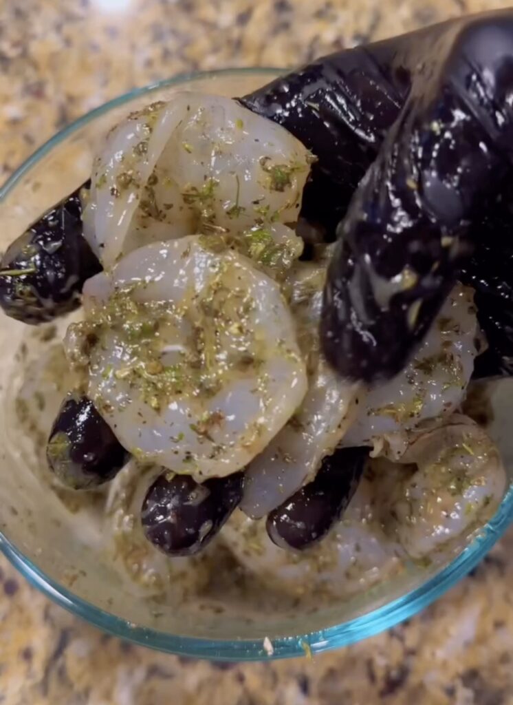 Rinse, peel, and devein shrimp. Season with olive oil and garlic & herb seasoning. Toss to coat and set aside in the fridge.