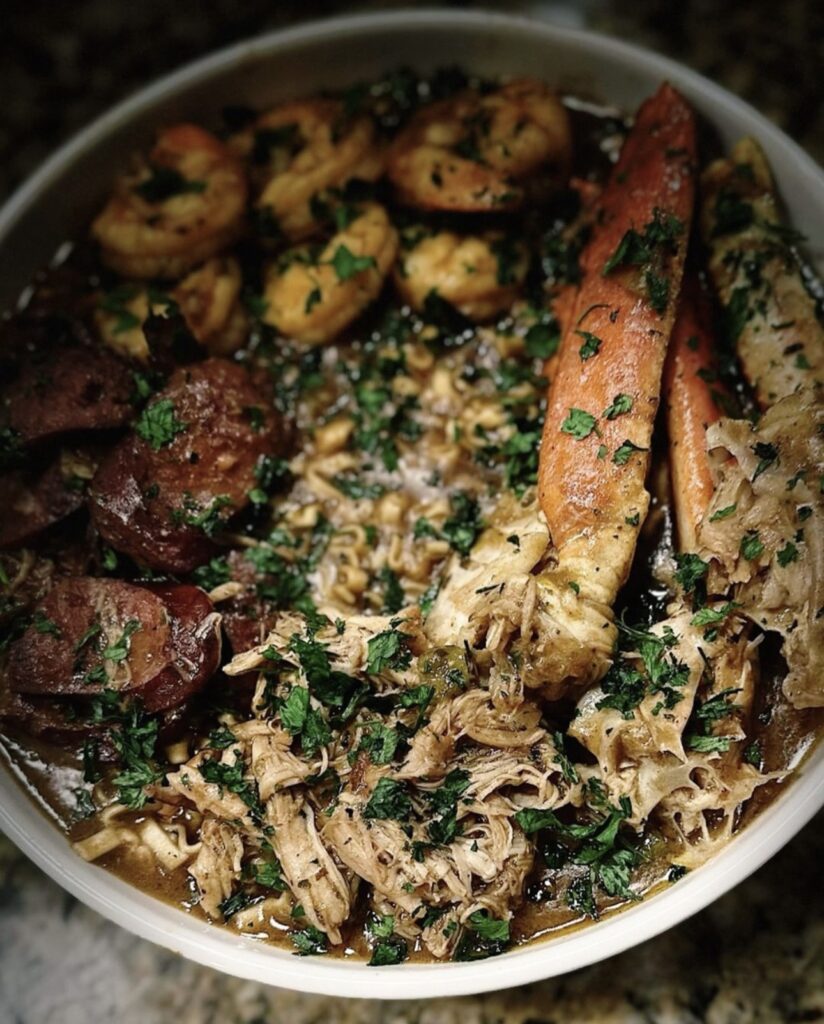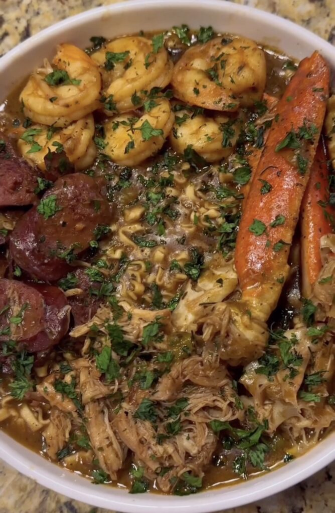 Remove chicken thighs and debone them. In each bowl, layer cooked ramen, gumbo broth, shrimp, sausage, crab legs, and shredded chicken. Garnish with fresh parsley.