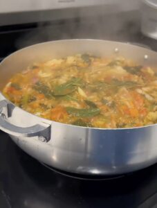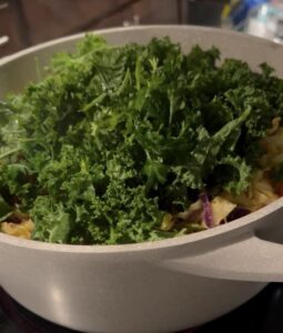 Toss in the kale and parsley. Stir, reduce the heat to a simmer, and cover the pot. Let the soup simmer for about 20 minutes until the vegetables are tender but still vibrant.